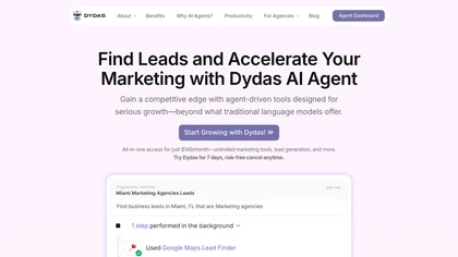 Dydas AI Agent Team offers a comprehensive solution for lead generation and marketing, designed specifically for agencies and businesses seeking to optimize their operations. This tool features a suite of 21+ premium agent-driven tools that integrate seamlessly with external APIs, enabling users to automate tasks, streamline workflows, and enhance productivity across various business functions.