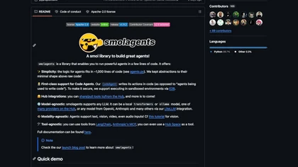 🤗 smolagents is a lightweight library for building AI agents that write Python code to call tools and coordinate other agents.Designed for simplicity, it has a minimal abstraction layer and supports first-class Code Agents, which generate and execute actions as Python snippets.