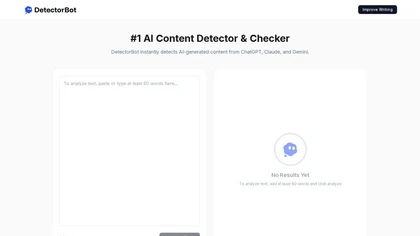 DetectorBot identifies AI-generated content from models like ChatGPT, GPT-4, Claude, and Gemini.It analyzes texts of at least 80 words using proprietary algorithms, providing detailed reports with confidence scores on AI-generated sections.