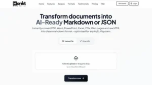 Monkt is a document transformation tool that converts various file types into AI-ready Markdown and structured JSON formats. It supports
