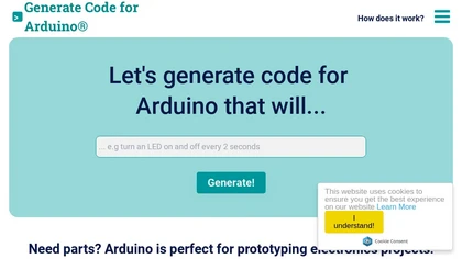 The tool is a code generator for Arduino. It emphasizes the compatibility of the Arduino boards, particularly the Elegoo Uno R3 and Mega2560 R3 boards. The tool includes 37 sensor modules and a CD with various tutorials. The generated code is based on GPT-3, an open-source language-generating model, and must be reviewed before being uploaded to hardware devices. The tool is not affiliated with Arduino, but it is part of the Amazon Services LLC Associates Program, which allows the site to earn advertising fees from Amazon.com links.