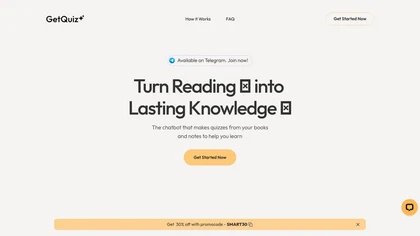 GetQuiz is an AI-driven quiz maker that facilitates enhanced learning through interactive quizzes generated from uploaded reading materials. Users can join the AI companion via Telegram, initiating their learning experience with the press of a button.