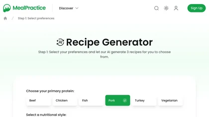 Mealpractice is an AI-powered recipe generator that allows users to select their preferred ingredients and nutrition style to generate three recipe options to choose from. Users can select their primary protein, cuisine style and get suggestions based on their selections. The tool also offers a dark mode design for easy use. Users can create an account to explore and discover new recipes, view meals, find menus and connect with others.