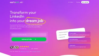 ApplyKit is an AI-driven tool designed to enhance LinkedIn profiles and streamline the job application process. With features such as automated CV generation, custom cover letter creation, and profile optimization, users benefit from tailored applications that align closely with job requirements.