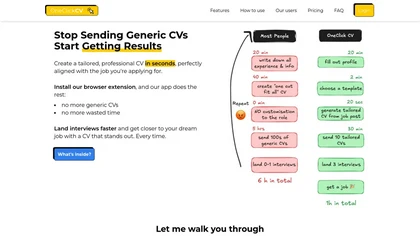 OneClickCV is a tailored CV and cover letter generator designed to help job seekers create customized application materials quickly. Users can install a browser extension to streamline the CV building process, ensuring that their submissions are closely aligned with specific job postings.