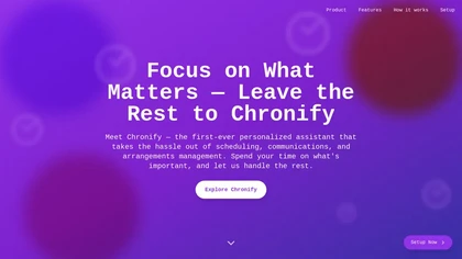 Chronify is an AI-driven scheduling assistant designed to streamline the management of time and communications. By automating scheduling tasks, meeting reminders, and the organization of daily responsibilities, Chronify enables users to prioritize their important commitments without the stress of manual planning.