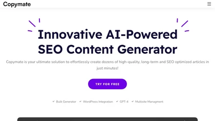 CopyMate is an AI-powered SEO content generator that allows users to effortlessly create high-quality, long-term SEO optimized articles in minutes. It offers bulk generation, WordPress integration, GPT-4 language model, multilingual content creation, and multisite management features. With CopyMate, users can reduce content costs massively while boosting their website’s SEO and increasing organic traffic.