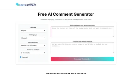 Easy Comment Generator is a tool that helps boost conversion by creating tailored comments for social media platforms like TikTok, YouTube, Instagram, and LinkedIn.It supports multiple languages and offers various writing styles (casual, professional, funny, etc.), allowing users to customize tone and length.