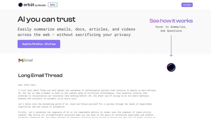 Orbit is an AI tool designed to efficiently summarize emails, documents, articles, and videos on the web, while prioritizing user privacy. Integrating seamlessly with Firefox, Orbit eliminates the need for account creation, allowing users to instantly access summaries without compromising personal information.