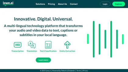 Izwe.ai is a multi-lingual technology platform that transforms audio, video, and text data into local language captions and subtitles. It offers transcription, translation, text classification, and entity extraction services. The platform uses a “human loop” network of language specialists for the highest level of accuracy. Additional services include summarization, text classification, entity extraction, call center, interview, board record, and video subtitle generation.